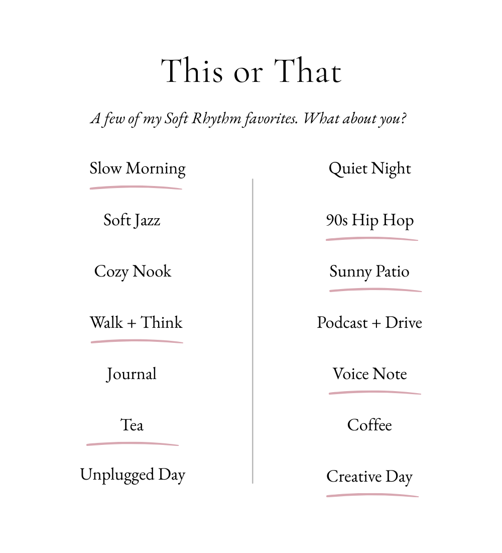 Soft Rhythm grew from that moment. A simple decision to stop pushing past myself and start honoring what I needed. Slower mornings. Softer goals. More truth. More room to breathe.